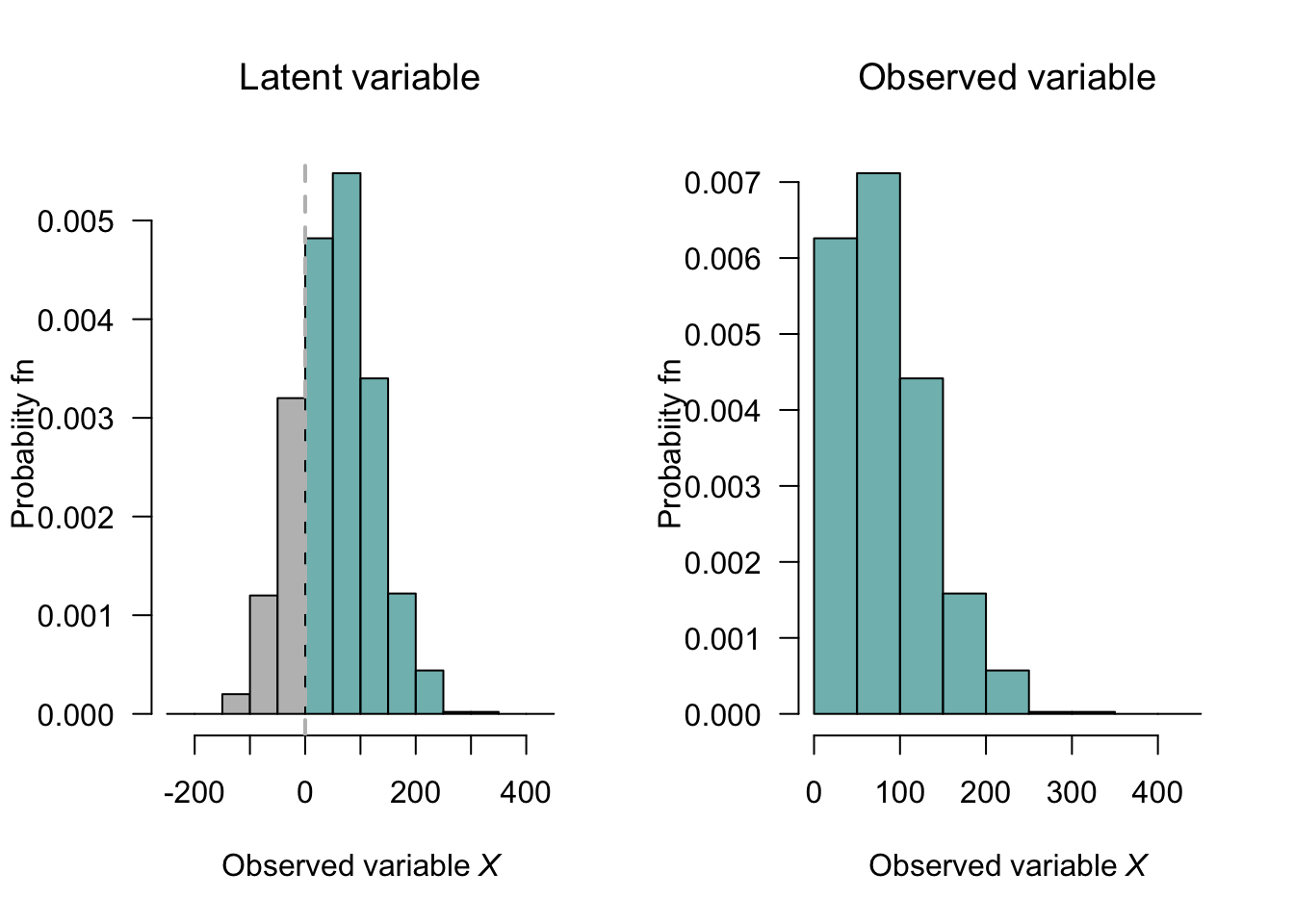 Example 9.4 (Latent variables and censoring) Consider the number of hours worked (which can be observed), which must take a non-negative value. We could assume an underlying, unobserved latent variable such as ‘willingness to work’. Negative values for ‘willingness to work’, no matter how small or how large, all result in zero observed hours of work.