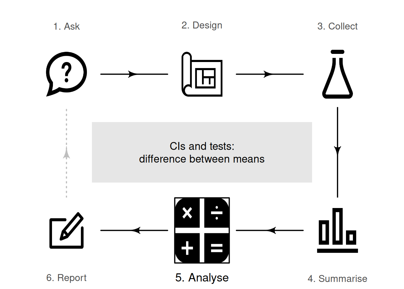You have learnt to ask an RQ, design a study, classify and summarise the data, construct confidence intervals, and conduct hypothesis tests. In this chapter, you will learn to: