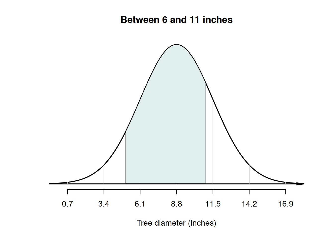 Consider again the model for tree diameters in Example 20.6 (Aedo-Ortiz, Olsen, and Kellogg 1997): a normal distribution with \(\mu = 8.8\) inches, and \(\sigma = 2.7\) inches.