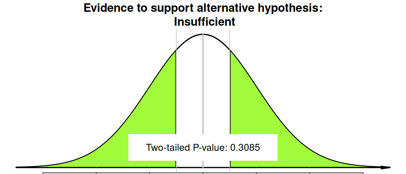 More generally, evidence is evaluated using a \(P\)-value. \(P\)-values refer to the area more extreme than the calculated test statistic in the sampling distribution.