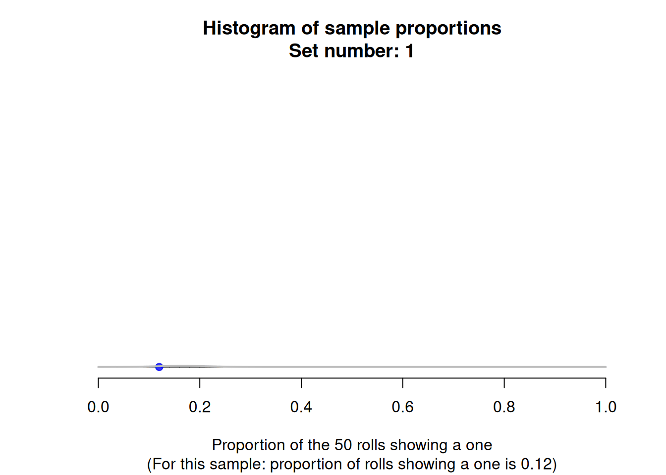 When a fair, six-sided die is rolled \(50\) times, what proportion of the rolls will produce a ⚀? That is, what will be the value of the sample proportion \(\hat{p}\)? Of course, no-one knows, because the sample proportion will not be the same for every sample of \(50\) rolls. The sample proportion varies from sample to sample: sampling variation exists and is described by the sampling distribution.